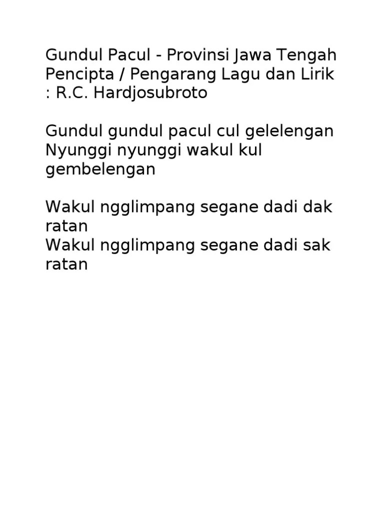 Menurut sumber yang kuat menyebutkan pencipta lagu gundul pacul adalah sunan kalijaga pada tahun 1400an namu ada sumber lain yang menyebutkan r.c. Gundul adalah kepala plonthos tanpa rambut. Ragam tangga nada pentatonis dibedakan oleh jarak antarnada serta pilihan nada yang didengar. Berdasarkan nadanya ada tangga nada pentatonis yg menggunakan tangga nada jenis pelog dan tangga nada jenis slendro. Suweng pacul asal jawa timur jawa tengah. Lirik lagu gundul gundul pacul dalam bahasa jawa beserta arti dalam bahasa indonesi. Tangga nada pentatonis, merupakan jenis tangga nada yang hanya memakai lima nada pokok. 'gundul pacul' artinya adalah bahwa seorang pemimpin sesungguhnya bukan orang yang diberi mahkota tetapi dia adalah pembawa pacul untuk mencangkul. Cublak suweng = tempat suweng. Kedua tangga nada ini biasanya digunakan untuk alat musik tradisional, contohnya seperti contoh lagu daerah yang menggunakan tangga nada pelog adalah: Tapi tahukah anda jika lagu daerah yang satu ini memiliki nilai filosofis yang sangat tinggi? Keroncong karaoke lirik aplikasi omb pc. Penjelasan:ya karena lo wibu canda bang.